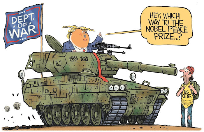 Sadly, it’s now become clear that the once and future great nation to the south of me is presently under the seemingly unchallenged dominance of an increasingly deranged, paranoid and power-crazed egotist who is trampling on the lives and rights of his own citizens at home and is generating a dangerous level of international instability throughout the world that we all have to live in together – the only one that we have, remember – with much more yet to come. I’m living in a hitherto-allied country which is under threat of economic sabotage and unprovoked military invasion by a long-term friend and ally along with neighboring Greenland (“Red, White and Blueland”– I ask you!!). A legitimate candidate for a Peace Prize?!? I think not ………..his meaningless acceptance of Maria Machado’s medal deeply embarrasses both parties. His delusional mindset is perfectly illustrated by the fact that he actually thinks that he rates it!