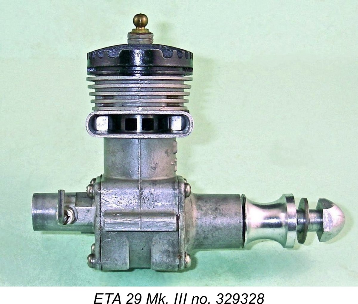 In November 1950 the Mk. III version of the ETA 29 appeared. The earliest examples differed little in external appearance from the MK. II. The new model retained the same head with angled glow-plug, the un-anodized one-piece backplate/venturi unit, the alloy rear disc and (initially at least) the large-diameter front bearing housing which had been used on the Mk. I and Mk. II engines.
