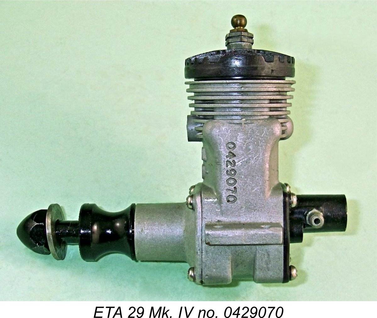 In August of 1956 a further revised model of the ETA 29 appeared in the shape of the Mk. IV version of the engine, which sold for a slightly increased price of £7 6s 4d (£7.32). Externally, this new model featured black anodizing on the backplate, aluminium alloy sleeve prop nut and prop driver to match the similar finish on the cylinder head. Otherwise, it looked more or less identical to its predecessor.