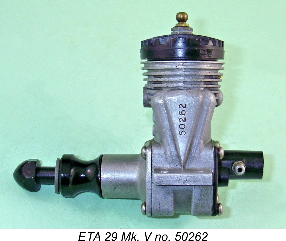 All variants used a two-piece fuel metering system with a screw-in surface jet supplying the fuel on one side of the intake venturi and a needle projecting through a stub carrier on the opposite side and traversing across the venturi bore to control the rate of fuel entry into the induction system. This was a very free-breathing arrangement since only the needle itself interrupted the induction airflow rather than a far thicker spraybar. This set-up had been introduced in the USA by the Hornet, McCoy and Dooling racing engines and was widely adopted by racing engine designers worldwide. The design details of the actual components applied to the ETA 29 underwent some changes as time went by, but the basic system remained unaltered. One of the attributes of the ETA 29 which set it apart from many of its ringed-piston competitors was the general excellence of the seal provided by the rings even in a brand-new engine. Peter Chinn commented particularly upon this point during his May 1954 test of the ETA 29 Mk. III (see below), stating that while any ringed-piston engine needs a little running to bed the rings in properly and produce a really good seal, the ETA was in his opinion better when new than most “transatlantic products” that he had experienced, some of which required a castor oil prime to generate an adequate compression seal for initial starts. As stated earlier, throughout the almost 20-year production life of the ETA 29 the overall appearance of the engine changed surprisingly little, particularly from the Mk. III variant onwards. Accordingly, the greatest challenge in assessing examples of the engine that may come up for sale is that of model identification. Many of the changes were internal, requiring that the engine be at least partially dismantled for confirmation purposes. This is of course highly problematic in the case of engines offered for sale on venues such as eBay where direct pre-sale examination is not possible. Moreover, it's never a good idea to disturb an engine that is well run-in and settled down.