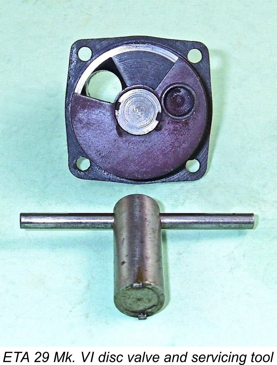 The Mk. V version of the ETA 29 which appeared in June 1957 is significant in that it was with this model that Ken Bedford finally replaced the inadequate alloy disc valve with a far more durable component made of Tufnol. This disc was mounted on a left-hand threaded rotor pin which required the use of a special ETA tool for removal.