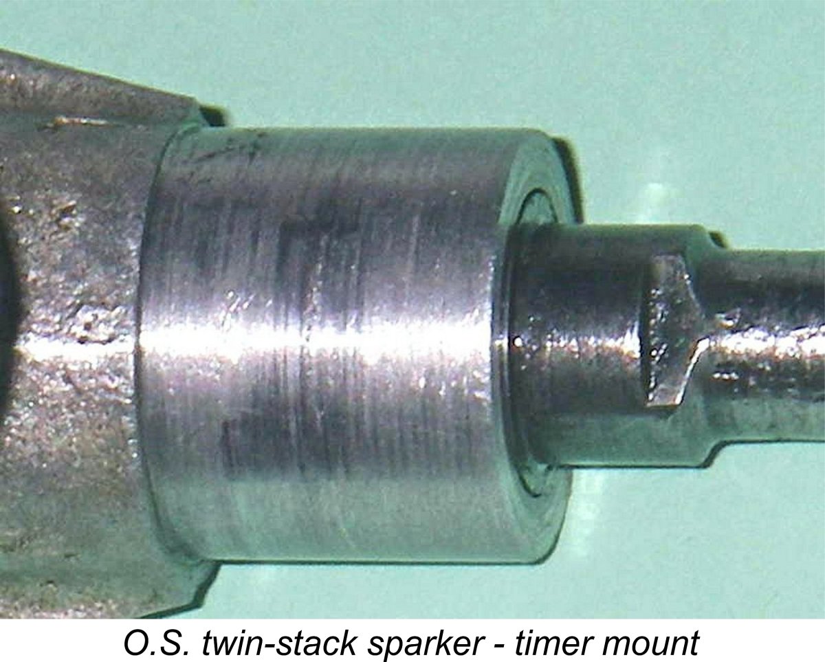 Following the removal of the fuel system, the next step was to unscrew the very substantial sand-cast backplate. This revealed a crankweb that appeared very similar to that of the later glow models. The cast alloy rod is clearly different, though—it is a very sturdy item with cast-in webs at the rear and a bronze bushing at the big end. A lot of hand-work appears to have been done to finish it after casting. The cylinder assembly is retained by only two screws which pass through the sand-cast head and integrally-formed steel cylinder cooling fins to engage with tapped holes located fore and aft in the case. There are two additional screws at the top to help to retain and seal the cylinder head. These thread directly into the upper flange of the steel cylinder. A nice touch is the fact that all four screws have locking washers installed under their heads. I removed all screws but left the head in place since it seemed to be well "stuck" on and I didn't want to break a good seal. The screws have a rather oddball metric thread of 3 mm x 0.65 mm—a slightly coarser thread than standard 3 mm items. I'd best not lose them!! Maris Dislers has pointed out that these screws were almost certainly threaded to the old and now long out-dated JIS (Japanese Industrial Standard) metric specification. These threads were basically similar to the old DIN and French thread forms that preceded the now widely-used ISO metric thread standard which was one of the first International standards agreed upon when the International Standards Organization (ISO) was established in 1947. Maris believed that the ISO threads only came into general use in around 1965, at which time O.S. apparently dropped the JIS threads and went to the ISO standard. Oddly enough, Enya continued to use the JIS fasteners for far longer, right up to the Enya 11CX with its unusual crankshaft thread and those seemingly coarse 3 mm screws for retaining mufflers on the cross-flow engines. That said, up to now I have been unable to gain access to a thread data chart for those old JIS fasteners. The cylinder arrangement is more or less identical to that used later on the die-cast twin-stack 29 glow models. The exhaust port flange sits on a recessed shelf machined into the upper crankcase casting just The very heavy counterbalance on the crankweb necessitates the use of an asymmetrical rod. As can be seen in the side view of the rod, the actual rod column is located well to the rear of the big end bearing centre. The big end is bronze bushed and the small end is of very generous length, occupying most of the exposed width of the gudgeon pin within the piston. The piston has a conical top with no deflector, matching the plain conical configuration of the underside of the cylinder head. Unlike the pistons of the later .29 and .36 cuin. glow models, which used a separate gudgeon pin carrier riveted into the piston interior through the piston crown, the sparker employs a conventional fully floating gudgeon pin mounted in bosses formed integrally with the piston in the conventional manner. The gudgeon pin itself is a tubular steel item having brass end pads. The piston walls are rather thin and there is no increase in wall thickness at the boss locations. As a result, the bearing length for the gudgeon pin ends in the bosses is minimal, to the point where this may legitimately be considered a design weakness in my personal view. The crankshaft is generally similar to that of the later glow model apart from the fact that it has a far shorter The prop-nut thread on the crankshaft was originally 7 mm, but unfortunately on this example a previous owner has re-cut most of the thread to 6 mm. This rather botched effort can be seen on the accompanying image of the crankshaft. Fortunately, it doesn't affect the engine's appearance or functionality in any meaningful way. By far the oddest feature of this model is the timer design employed. As can be seen in the images, the timer is a simple axially-oriented leaf-spring open-frame device of a pre-WW2 type that had been abandoned by O.S. and others for a considerable time prior to 1948, when the twin-stack sparker was Although very well executed with a sturdy cast frame, the type of timer fitted to the twin-stack spark ignition model presently under discussion is rather rudimentary and would almost certainly have represented an impediment to the extraction of maximum performance. The point gap, for instance, is not readily adjustable. The sole advantage of this unit is its ease of maintenance—everything is exposed for convenient inspection and cleaning. We might suppose that perhaps Ogawa-san just liked the retro look of that timer style and appreciated its maintenance advantage. That is certainly a possibility, albeit in my view rather unlikely and certainly very "un-Japanese". Another possibility of course is that my Japanese colleagues have their dates wrong and the engine actually dates from well prior to 1948. This again seems highly unlikely—the engine bears no design resemblance whatsoever to any of Ogawa's pre-war and wartime designs. There's no doubt that it is best seen as a direct precursor of the twin-stack glow models which began appearing in 1949, and this is completely consistent with the reported 1948 date noted above. When considering the potential design operating speed of a spark ignition engine, a further design parameter that needs to be factored in is the dwell period provided by the timer. This is the angle of crankshaft rotation during which the points are closed and hence in direct electrical contact with each other, thus supplying current to the ignition coil's primary circuit. I've discussed this parameter more fully in my separate article on spark ignition engine operation. Since sufficient real time must be provided during each revolution to ensure full saturation of the primary coil winding before the points open to trigger the spark, the dwell requirement varies from engine t