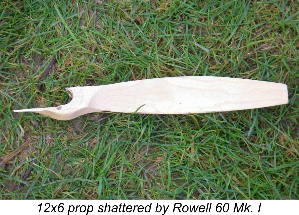 Thankfully, the engine came through this fairly strenuous test with flying colours. A subsequent check showed that things had stayed together very well indeed, with no signs whatsoever of any undue stress on the components. Compression seal remained outstanding (the "stone wall" of Wilf Rowell's published claim), as did all bearing fits. I'd have to say that these engines come as close to being bullet-proof as any large racing units of my past and present acquaintance. Next up was Mk. I Rowell 60 no. 116 which had been tested earlier. It was its usual good-mannered self, starting very easily and running flawlessly. It more or less matched its previous performance on the two props which were common to both tests. For comparison purposes, I also tried it on two of the additional props which I had used with the Mk. II Series 2. The results obtained were quite illuminating, as shown in the following table: