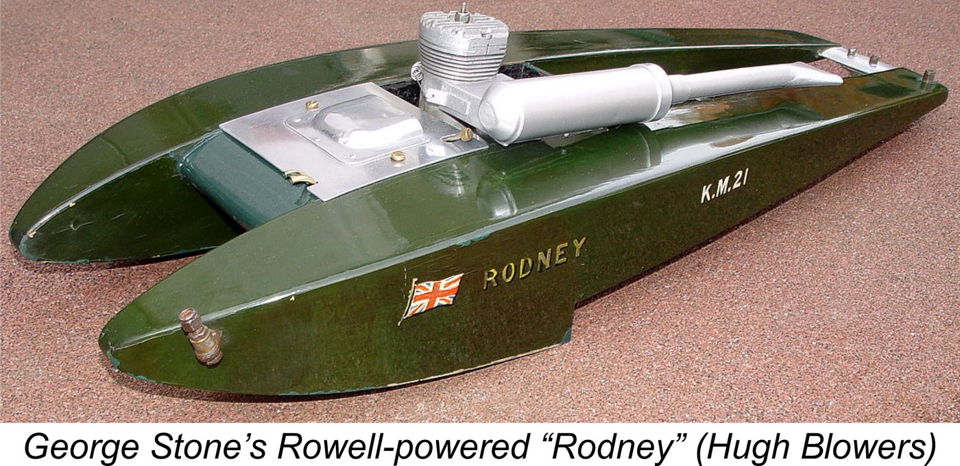 of the American-made Dooling, he fitted a Rowell into his hull "Rodney" in 1950 and issued his "try to beat me with a British motor" challenge. So equipped, "Rodney" achieved a speed of 54.74 mph, backing up Stone's challenge by becoming the fastest British-engined hydroplane at that time, albeit well short of matching the speeds achieved with the Dooling.