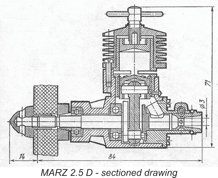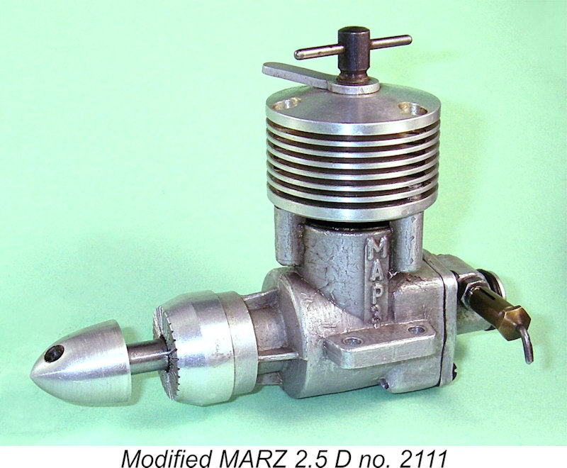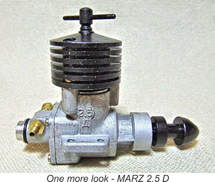 Otherwise, the MARZ is a more-or-less conventional twin ball-race diesel of classic "racing" pattern, with three conventional radially-disposed sawn exhaust ports completing the gas flow arrangements. Fits and finishes are generally good, although there are a few potential flaws (to be discussed below) arising from the fact that the engines were very much "mass-production" items dating from a time and place during which production quantity was far more highly valued than quality. The bare weight of 5.5 ounces (156 gm) is by no means excessive for an engine of this specification and performance, while the unit has a nicely compact appearance with a very low frontal area. Production and Distribution