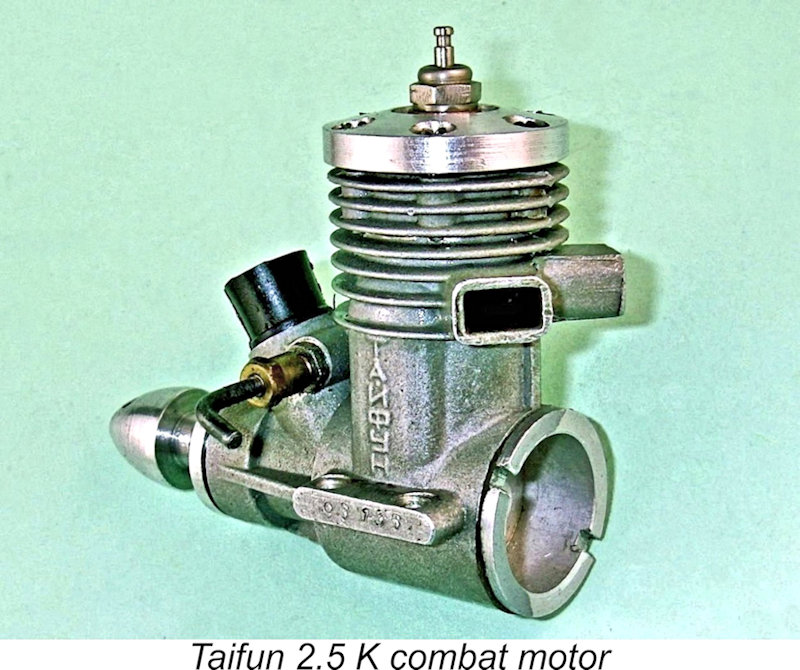 Many of these engines were distributed as intended through the State educational and sports club systems under DOSAAF supervision, although some were sold in Soviet hobby shops and others left the USSR by the clandestine means described earlier. Still others lingered for years in various storage facilities. Perhaps some of them still do ......... Ilya found that the MARZ factory had been making another model - a 2.5 cc ABC glow-plug unit intended for F2D control-line combat called the Taifun 2.5 K (Russian ТАӤΦуН 2.5 K). This had been designed by the ZSTKAM organization. It appeared in three successive variants having different crankcase designs, but only some 20,000 were produced – a paltry figure by Russian standards. Relatively few of these seem to have left Russia, although that has changed somewhat in recent years.