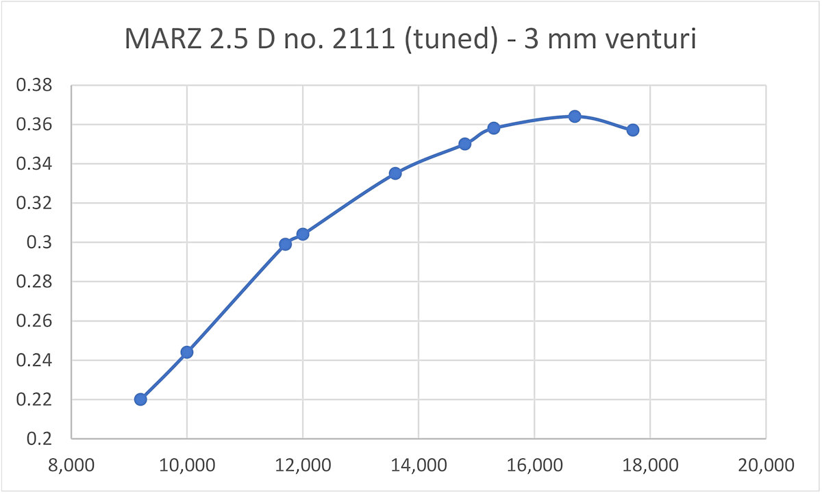 The implied power output from these figures is considerably below that obtained by Richard Herbert. This is doubtless due to the fact that Brian's data were obtained with the Macheast mufflers fitted to both engines. We would expect the use of a muffler to have a more than normal impact upon output due to the sub-piston induction, which will encourage the ingestion of spent exhaust gases instead of air. Before being put into service in 2007, my own unmuffled "flyer" example of the MARZ, engine no. 2111, was subjected to a tune-up and careful rebuild followed by a lengthy break-in. It subsequently accumulated a couple of hours of high-speed running time in the air, after which I put it on the test bench in 2008 to assess its performance. The engine as tested was fitted with a 3 mm dia. venturi, which I had found to be far more consistent in the air than the optional 3.5 mm dia. fitting. The following data were recorded: