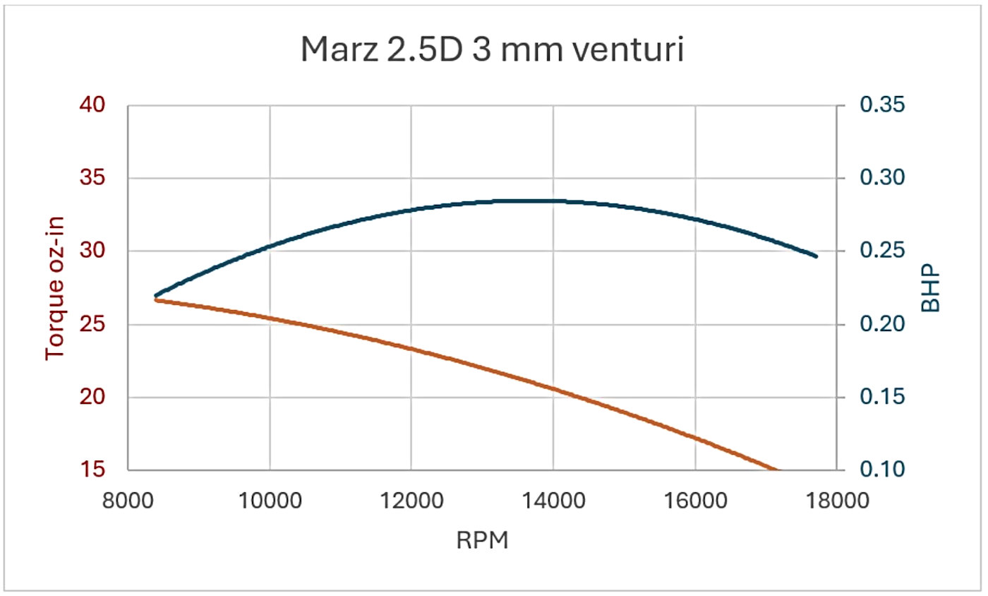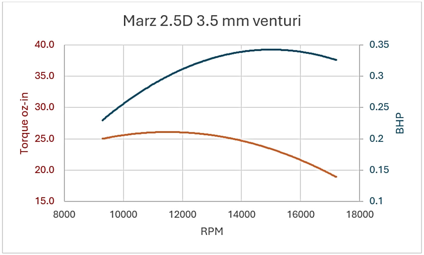 The above graphs represent typical MARZ engine performance as reflected in the tests summarized above. The effect of increased induction capacity through the larger venturi is evident in the torque trend, which is extended and maintained considerably further along the RPM scale, allowing peak power to increase from 0.28 BHP @ 14,000 RPM to 0.34 BHP @ 15,000 RPM. Particularly well-fitted examples peak at slightly higher speeds. The larger venturi means slightly faster airspeeds in level flight or allows working with a propeller “one size up”, but compromises easy starting and suitability for aerobatic work. Now back to Adrian .............. An Experienced MARZ Re-tested