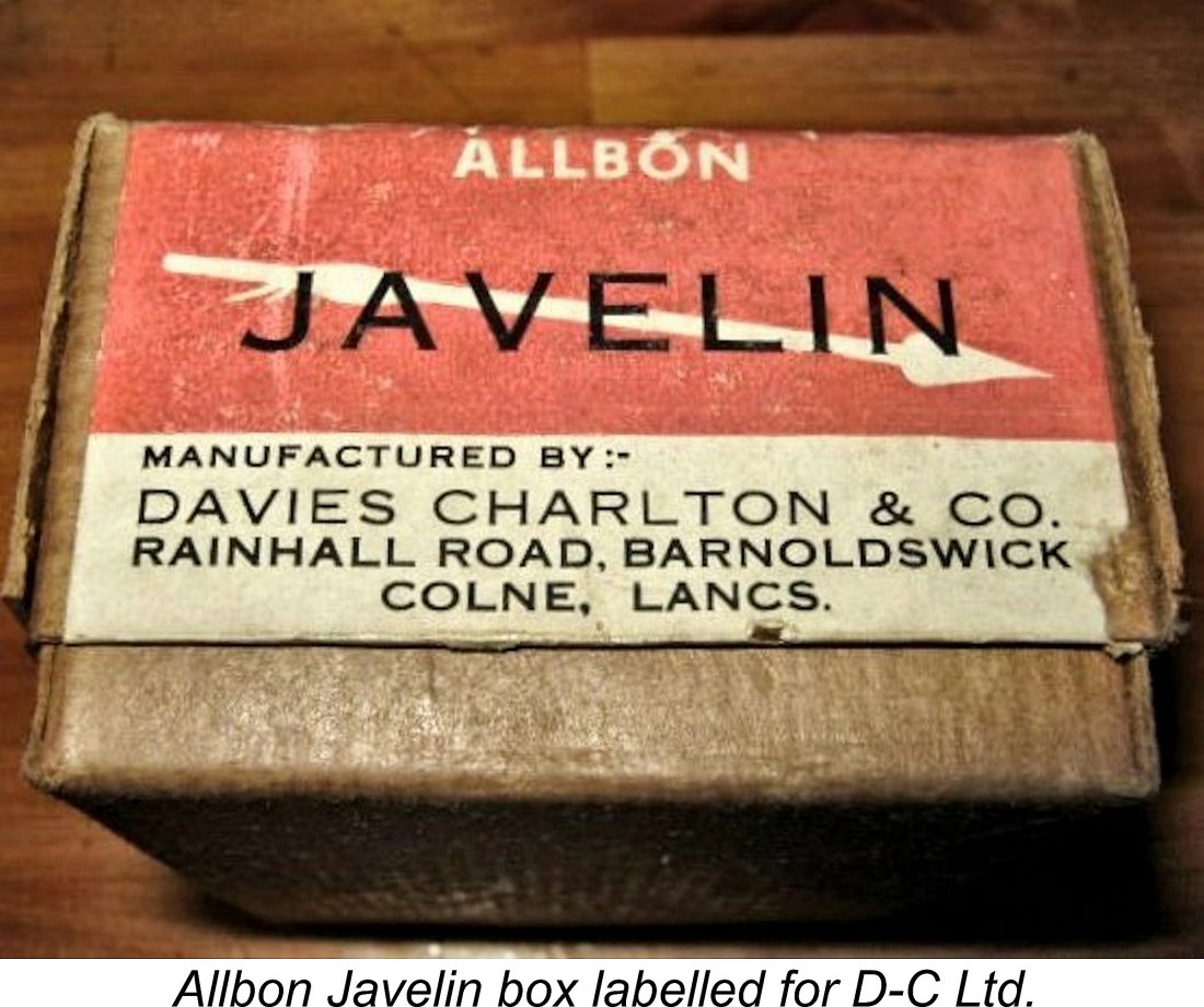 The fact that the Dart was the only advertised Allbon model during most of 1952 would seem at first sight to imply that the manufacture of both the Mk. I Javelin and the Arrow had been suspended. New Old Stock examples of both the Javelin Mk. I and the Arrow which had been manufactured by Allbon Engineering remained available from specific retailers during this period, but there's little or no doubt that the production of the somewhat lacklustre Arrow was never resumed following the wind-up of Allbon's Cople operation. However, the same does not seem to be true of the Javelin Mk. I. Australian reader Bob Allan has kindly provided irrefutable evidence for the fact that at least some examples of the Javelin Mk. I were manufactured by D-C Ltd. at Barnoldswick. This evidence takes the form of a Mk. I Javelin box which expressly states that the manufacturer was D-C Ltd. It would appear that as the stock of Mk. I Javelins which had been manufactured at Cople ran out, Allbon understandably wished to maintain some level of supply for that very popular model, hence contracting with D-C Ltd. for the manufacture of an unknown number of examples of the Javelin at Barnoldswick.