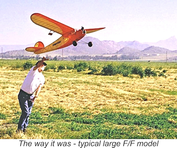 Prior to 1937, the majority of model engines were used to power large free flight model aircraft such as that seen taking flight at the right. Since these models were uncontrolled following launch, attempts to achieve high speeds would have been potentially hazardous, to say nothing of the difficulty of obtaining accurate speed measurements. Contests were therefore based upon flight duration for a given motor run, thus making light weight and operational consistency the primary goals of engine designers. For a taste of how things used to be, check