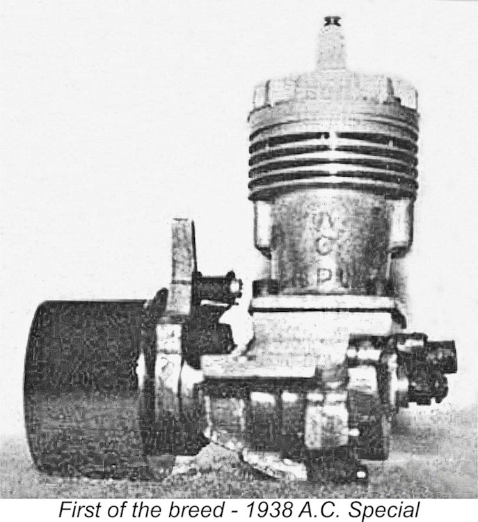 This article is actually a re-organization and enhancement of an earlier piece which appeared on the late Ron Chernich’s “Model Engine News” (MEN) website in September 2012. I’m re-publishing it here to prevent its loss as Ron’s now-frozen and administratively-inaccessible site steadily deteriorates due to lack of any opportunity to maintain it. The Bungay 600 has considerable significance from a historical standpoint in that it was the last of a series of pioneering crankshaft front rotary valve (FRV) racing motors which challenged the rise to prominence of the "classic" big-bore model racing engine with its disc rear rotary valve (RRV) induction. The telling of the Bungay story thus affords an ideal opportunity to summarize a very interesting technical debate which took place in the context of the early development of model racing engines. As always when discussing an American model engine from the "classic" era, it's necessary right up front to pay tribute to my late and very much-missed friend and colleague Tim Dannels, former Editor of the Engine Collectors' Journal (ECJ). Tim's indispensable American Model Engine Encyclopaedia is a required off-the-shelf reference for anyone having an interest in the products of the American model engine industry. Much of the background material for this article was extracted from that work as well as from back issues of the equally highly-recommended ECJ. Our shared debt to Tim can never be repaid. I'd also like to express my very sincere appreciation of the considerable assistance provided by my valued English friend Miles Patience. Miles is lucky enough to own two original examples of this mega-rare engine. He was most geneous in providing component images which did much to clarify many details of the engine's construction. Thanks, mate! Let's begin now by looking at the background to the development of this very original model engine design. Background