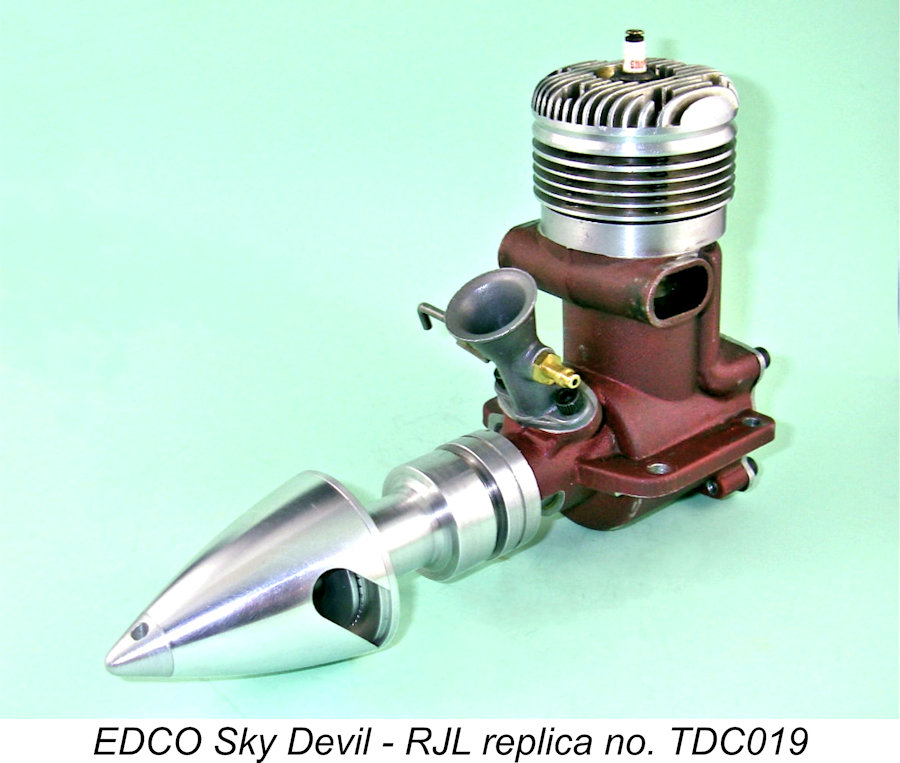 Original examples of the EDCO engines such as the near-mint example illustrated above are pretty rare these days. The example of the EDCO Sky Devil which is illustrated here at the left is one of some 250 fine .649 cuin. replicas produced in 1983 by Randy Linsalato of RJL (now combined with MECOA). These were made under contract for the late Terry Toupes. Internally, they are not exact replicas, utilizing some readily-available parts from other engines to keep costs under control and lacking the radically-extended prop driver/spinner combination – the components fitted to the illustrated RJL engine are home-made look-alikes. This having been said, in many ways the quality of these RJL replicas equals or even exceeds that of the originals, from which they may be readily distinguished by having the inner surfaces of their exhaust stacks anodized as opposed to the plain milled finish of the originals. They also carry serial numbers having a TDCxxx pattern. These engines run very well indeed and are now fine collectibles in their own right. Randy began work on a second series which was to be closer to the originals, but this project never reached completion due to fading customer interest. My sincere thanks to Randy for personally sharing this information with me. Check out Randy's website – he continues to offer fine products!