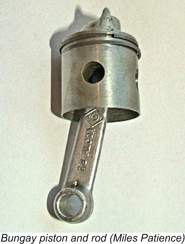 Ingram reported that the Bungay designers were very much aware of the desirability of reducing reciprocating weight to a minimum. To this end, the Bungay employed an unusually thin-walled piston which was cast using what the manufacturers claimed to be their "own exclusive process". The conrod was forged to minimal dimensions consistent with reliability. A relatively thin-walled lightweight gudgeon pin was featured. The rod featured an un-bushed big end bearing with an oil hole for lubrication. Ingram observed weight measurements taken on the Bungay piston/rod assembly against a similar measurement for another unidentified "typical" racing engine of the same displacement. Using the same scale, the Bungay assembly reportedly weighed 205 grains (13.28 gm) against the 290 grains (18.79 gm) of the other unit - a difference of some 29% in favour of the Bungay.