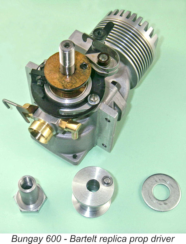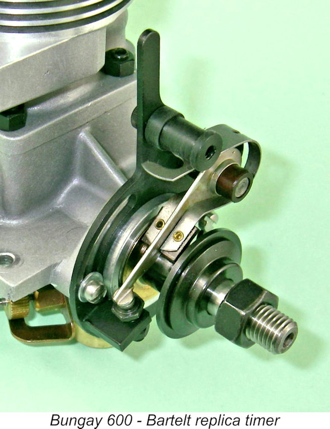 The timer design was quite original. The components were mounted on a stamped steel frame which was a close fit over the outside diameter of the front ball race housing. This housing incorporated an expanded section at the rear which formed a flange against which the timer frame abutted. The unit was secured against this flange by two screws with washers. These screws passed through annular slots in the frame to engage with tapped holes in the front of the mounting lugs. The slots permitted the timer to be rotated through 90 degrees using the integrally-formed timer arm. The ability to vary the tension on the screws allowed easy adjustment of the unit's resistance to rotation. Overall, the arrangement provided very secure fixing of the engine's timing while permitting easy adjustment during operation if necessary. Once a satisfactory running setting was established, the screws could be tightened down firmly to preserve the adjustment. The fixed point was attached to a lug which was brazed onto the timer frame at the front. A conventional automotive-style moving point was employed. The cam was machined at the rear of the steel prop driver, which was secured to the shaft using a Woodruff key. Interestingly enough, the prop driver had no serrations of any kind on its driving face to resist prop slippage. It did however feature a hole drilled through it at one point, presumably to accommodate a plug key inserted into the prop or flywheel hub. With an engine of this torque potential, such a provision would have been very necessary. A conventional prop nut and washer were used to secure the airscrew. According to the company's literature, the flywheel-equipped race car version of the Bungay 600 possessed a feature called automatic timer advance. This was presumably some kind of spring-actuated delayed-action system which advanced the timing automatically from the retarded starting setting to the best running setting over a short period of time after starting. This would have been a great advantage for push-starting a model race car. Since I don't currently have an example of this fitting to examine, I can provide no details of the mechanism.