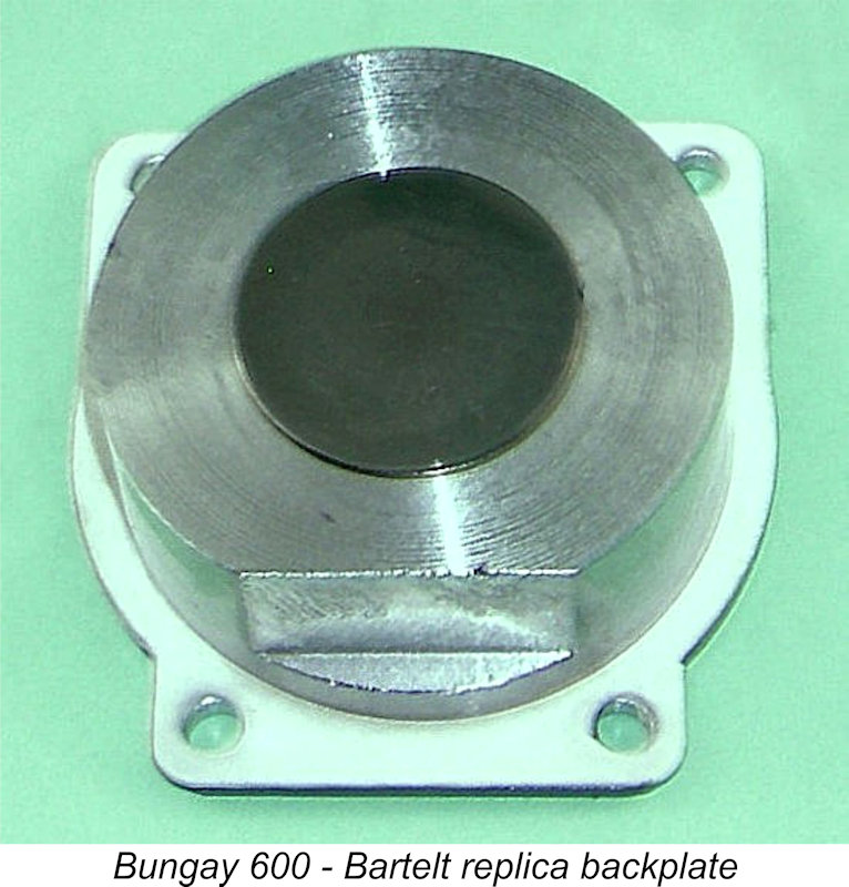 In many respects, the Bungay was a typical large racing engine of its time. It featured spark ignition controlled by an automotive-style timer; cross-flow loop scavenging; a sidestack exhaust; a ringed aluminium piston with a high domed baffle crown; and a twin ball-race crankshaft. In fundamental design terms, its only real departure from the established formula was its use of FRV induction. The Bungay featured then-standard bore and stroke measurements of 0.940 in. and 0.875 in. respectively, exactly as featured in the McCoy and Hornet 60 models among others. This gave the engine a displacement of 0.607 cuin. (9.95 cc). Claimed all-up weight minus flywheel, coil and other ignition equipment was 16.25 ounces, although the Bartelt replica in my possession weighs in at 485 gm (17.10 oz.) bare with plug.