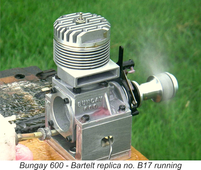 Ingram reported seeing a Bungay 600 turning an 8x6 airscrew at 19,400 rpm on the bench using straight methanol/castor oil fuel. If that prop had been a present-day APC, it would have taken an output of around 1.1 BHP to achieve that figure based on established power absorption coefficients. Not having details of the prop involved, all that we can say is that the performance observed by Ingram seems entirely consistent with the manufacturer's performance claims. Ingram reported that no mechanical failures were observed during the course of the tests which he witnessed. A parameter which was widely touted by model engine manufacturers at the time, particularly those involved in the production of car racing engines, was the engine's free speed capability when running without load. Although this is completely irrelevant in terms of the engine's performance under load, it was frequently quoted by manufacturers, presumably in an effort to impress the customers. The Bungay advertising claimed a free speed of 27,000 rpm, although the claim made to Ingram during his visit to the factory and repeated in the instruction sheet was increased to 28,000 rpm. Apart from leaving us impressed that the engine could withstand such abuse, the fact that this was 10,000 rpm beyond the unit's claimed peak renders the figure of little practical value. One supposes that it might have had "insurance" value to car and hydroplane users given the fact that engines used in those disciplines had to withstand very high speeds when the unit was unloaded either during the start-up procedure or as a result of airborne "excursions" during operation! Overall, Ingram was clearly very impressed with the Bungay, summarizing it as the result of "extensive research directed towards development of a racing engine of unusually high output" and characterizing the results achieved as "outstanding". Quite a testimonial! The Replica Bungay 600 On Test