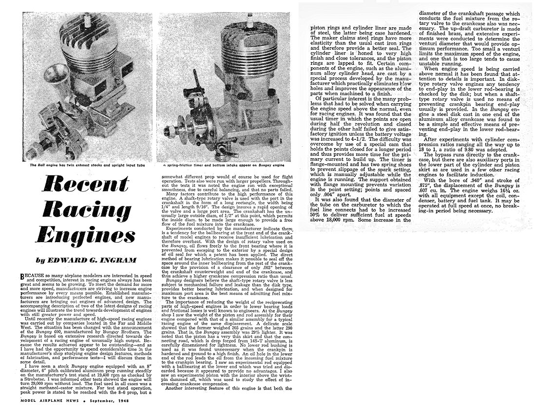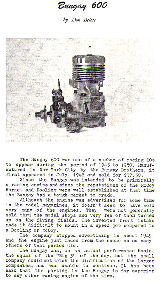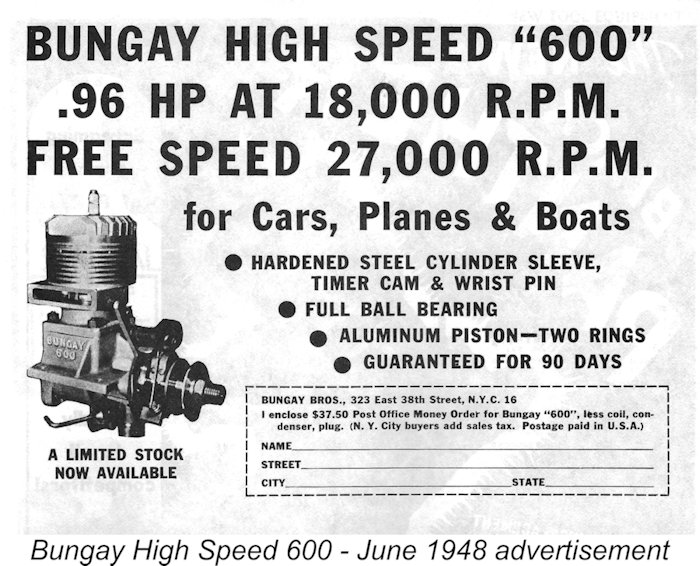 In this article I’ll take a look at the Bungay "High Speed" 600, an almost-forgotten early post-WW2 American model racing engine which was among those which unsuccessfully challenged the "classic" racing engine formula established by the