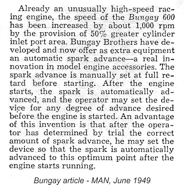 The final contemporary mention of the Bungay 600 that I've been able to find appeared in another article by Edward G Ingram which was published in the June 1949 issue of "Model Airplane News" under the title "Present Day Motors". The Bungay engine was covered in a single paragraph (left) in this article. It seems that the manufacturers had continued their development program, since Ingram reported that they had This modification must surely have been achieved through the addition of at least one extra transfer opening in the cylinder wall, perhaps in combination with an increase in area of the individual openings. It's possible that a revised upper casting was also involved, although Ingram made no mention of this. The balance of the paragraph was devoted to an operational description of the auto-advance timer to which reference was made earlier. The implication was that this timer was a later development which followed the initial release of the engine. It seems that the engine was started with the timer in the fully retarded position, after which it automatically advanced itself to a pre-set running position. The operational advantages of this are obvious. Unfortunately, Ingram did not provide any details of the mechanical design of the timer, leaving us still in the dark on that point. This was the Bungay’s final appearance in the modelling media until it made a brief appearance in the January/February 1965 issue of ECJ, some 16 years after it had disappeared from the scene. This reference took the form of a short article by the late Don Belote, as reproduced above at the right. Thereafter, no more was heard of the engine until the appearance of the present article in its original form on MEN in September 2012. Conclusion
