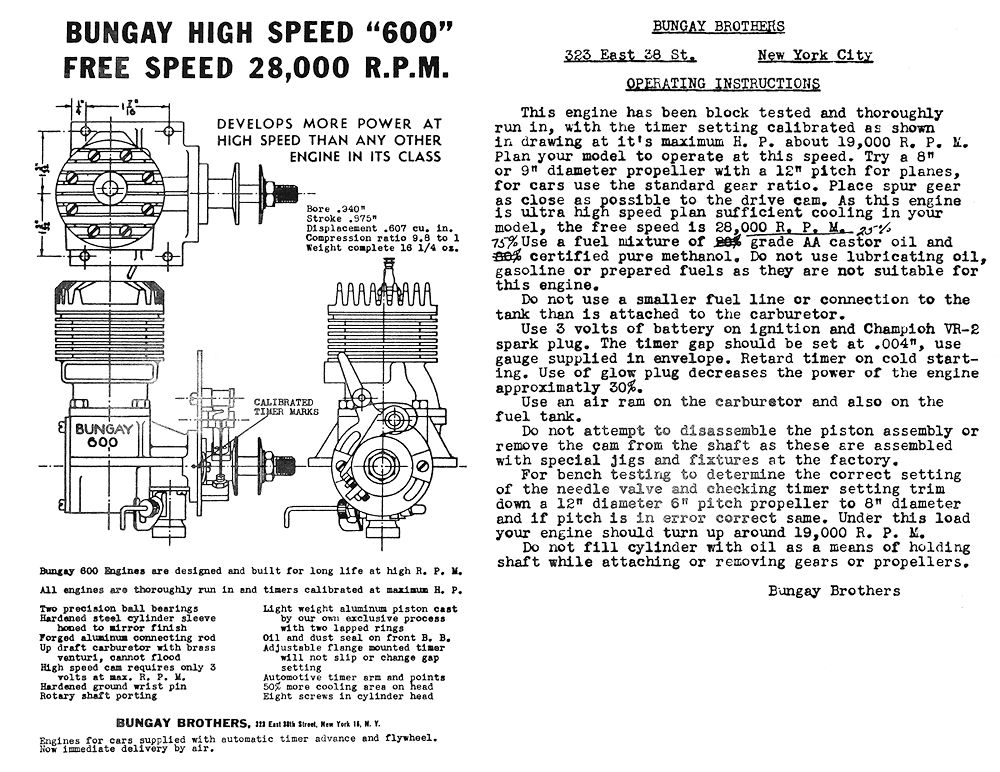 The Bungay designer solved this problem very neatly by installing a steel disc on the front face of the backplate. This both minimized rearward movement of the rod and presented a steel restraining surface, thus creating an alloy-on-steel working combination which was far longer-wearing and less likely to create metallic particulates. The plate had a central spigot which passed through a hole in the centre of the backplate and was secured by swaging from the outside once installed. Overall, one gets the impression that some well-focused design thinking went into this engine. The castings too are unusually complex, indicating either that the manufacturers were experienced producers of high-quality castings or that they had ready access to such expertise. Although the commercial glow-plug had well and truly arrived by mid-1948 when the Bungay first appeared, the engine was specifically designed for spark ignition operation. In fact, the manufacturer's instruction sheet stated that the use of glow-plug ignition would reduce power output by some 30%. Given the rapid rate at which the glow-plug displaced spark ignition from this time onwards, we might doubt this statement for an engine that was properly set up, fuelled and loaded - other contemporary Recommended fuel was a straight mixture of methanol and AA castor oil. The original typed instructions specified an 80/20 mix of these two components, but the copy reproduced here has had these figures altered by hand to 75/25 - whether by the manufacturers or by an owner is unclear. Perhaps experience showed that the higher oil content was an aid to longer life and greater reliability at the very high speeds at which this engine was intended to operate. The instruction sheet specifically warned against the use of gasoline in this unit. The instructions also claimed that each engine was fully run-in at the factory and was therefore ready to run fast as supplied. If this was indeed the case, the Bungay Brothers must have enjoyed a certain notoriety among their New York neighbours when it came to ongoing noise levels emanating from their operation! The Bungay High Speed 600 - Design Considerations
