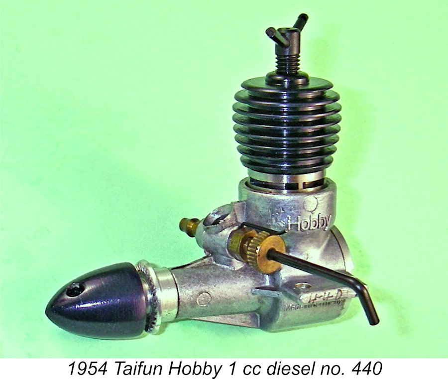 Hans Hörnlein’s initial response to this desire appeared in 1954 in the form of the vastly improved Taifun Hobby 1 cc diesel. This was the first of a series of Taifun model diesels using a screw-in cylinder in place of the former three-bolt system which had been found wanting. The Hobby was a commendably light and compact 1 cc plain bearing diesel using FRV induction. Bore and stroke were 10.67 mm and 10.92 mm respectively for an actual displacement of 0.98 cc. The engine tipped the scales at 63 gm (2.22 ounces).
