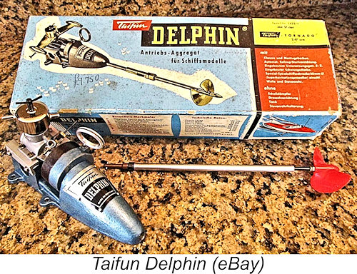 I tuned my flying" example of the Tornado, engine no. 17960, to improve its performance somewhat. This included lightening the piston and creating a little counterbalance on the crankweb. I also modified the crankshaft induction port a little to improve its funtionality. This engine ran very strongly with minimal vibration, serving me well in a number of models. A bench test some years ago implied a peak output of around 0.285 BHP @ 13,500 RPM. The one downside was the very vulnerable original Taifun needle valve, which invariably broke in the first hard crash! I replaced it with a far sturdier P.A.W. assembly, with which it worked very well. This was the usual fate of the externally-threaded needles used in all of the early Taifun models. The Rasant was also the subject of a published test report, although this was one of Peter Chinn's condensed "mini-reports" which appeared from time to time in an attempt to keep up with the large number of new engines then passing through Chinn's hands (how times change!). The report on the Rasant was published in the February 1956 issue of "Model Aircraft". No actual performance data were presented beyond the bare statement that Chinn's testing confirmed the manufacturer's claimed figures of 0.23 BHP @ 12,000 RPM. Way back in 2007 I ran my own test of my previously-illustrated “experienced” example, engine no. 24057, finding an implied peak output of around 0.225 BHP @ 11,500 RPM. This result was a perfectly respectable performance for a lightweight plain-bearing 2.5 cc sports The Rasant was also reviewed in the "Logging the Motor Mart" feature which appeared in America in the October 1955 issue of "Flying Models". This review confined itself to a description of the engine together with a few prop/RPM figures. Its main value in a historical context is its confirmation of the fact that the Taifun range was then being distributed in the USA by the Wilshire Model Center of Santa Monica, California. The Graupner company was clearly extending its market reach! The Taifun engines were also offered in water-cooled guise for use in model boats. A very interesting accessory which appeared at some point was a unit called the Taifun Delphin. This was a mount for the marine version of the Tornado which incorporated a recoil pull-starter and a water-screw drive shaft with propeller. It was notable for the ingenuity of its design as well as its quality, but it doesn’t appear to have achieved a particularly high level of popularity. Next Step – the Taifun Hurrikan