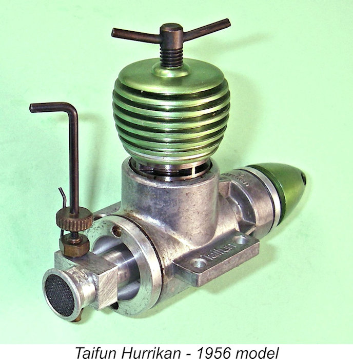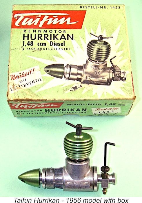 The models just described had replaced the original Taifun Junior, Blitz and Meteor respectively. However, the 1.5 cc displacement category had been unrepresented in the Taifun range since the withdrawal of the 1.5 cc three-bolt Record in 1954. This changed with a vengeance in mid-1956 with the appearance of a completely revised 1.5 cc diesel – the famous Taifun Hurrikan.