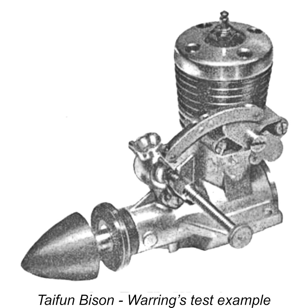 The Bison was the subject of a published test report by Ron Warring which appeared in the June 1961 issue of “Aeromodeller” magazine. Warring was highly complimentary regarding the standard of the engine’s construction, stating that “workmanship throughout is first class, with an excellent piston-cylinder fit”. The Bison was apparently supplied with both an R/C throttle assembly and a conventional venturi insert for control line or free flight applications. Warring tested the engine in both configurations, finding that the installation of the throttle produced “a penalty of 600 RPM at 10,000 RPM and approximately 1,000 RPM at higher speeds”. Presumably to show the engine in its best light, he only reported performance figures for the engine in un-throttled form.