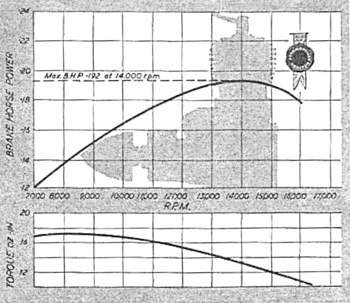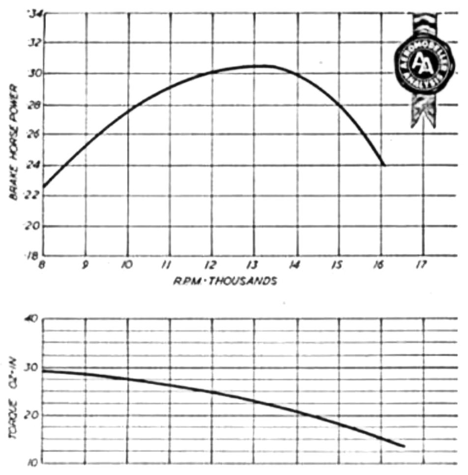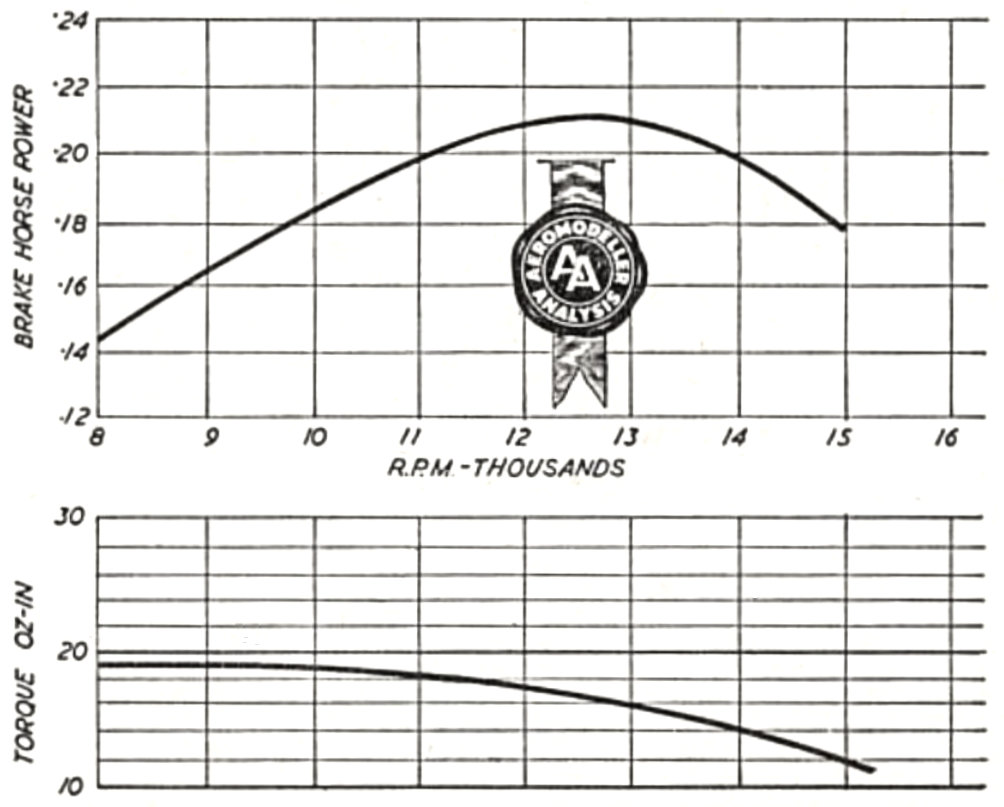 As far as output went, the tester reported a peak of 0.234 BHP @ 13,500 RPM. This fell somewhat short of the manufacturer’s claim of 0.27 BHP @ 14,500 RPM, but the tester felt that a “good” example which was well run in might well approach the claimed figures. A looser contra-piston would probably also have helped in permitting the establishment of an optimized compression setting at any given speed.