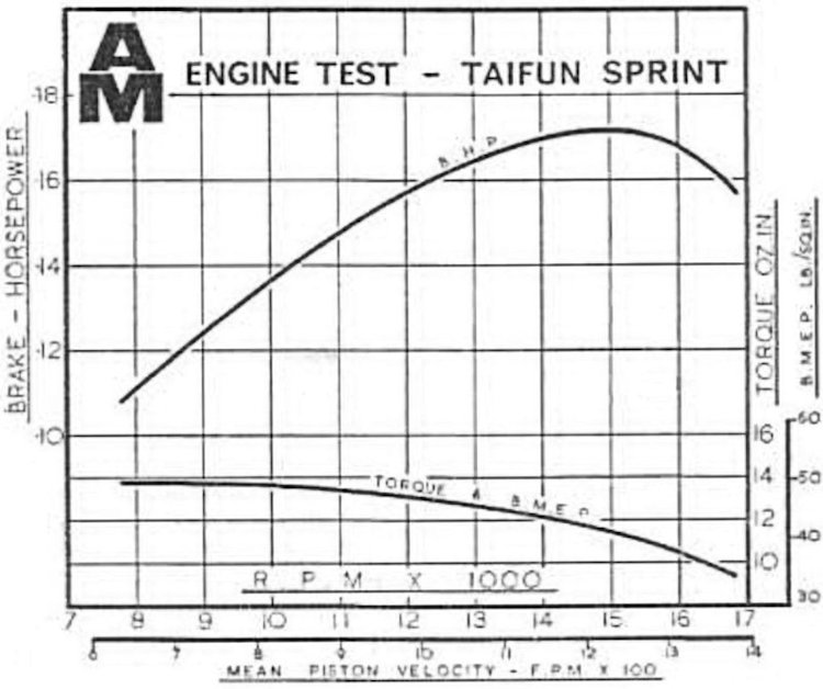 This test was published in the April 1954 issue of “Model Aircraft”. Although unattributed, the report was almost certainly authored by Peter Chinn. The tone of the test report was almost uniformly positive. The engine was said to be “nicely made”, with the quality of the main die-casting drawing particular notice as being “outstandingly good”. The manufacturers were commended for supplying a beechwood test mounting block, a tommy bar for the spinner nut and a length of suitable fuel tubing. Apparently all Taifun motors were supplied with this equipment. In performance terms, starting both hot and cold was said to be “easy”, with no requirement for a preliminary exhaust prime. The engine was found to run without excessive vibration, also being “reasonably smooth running” and exhibiting no tendency to sag when hot.