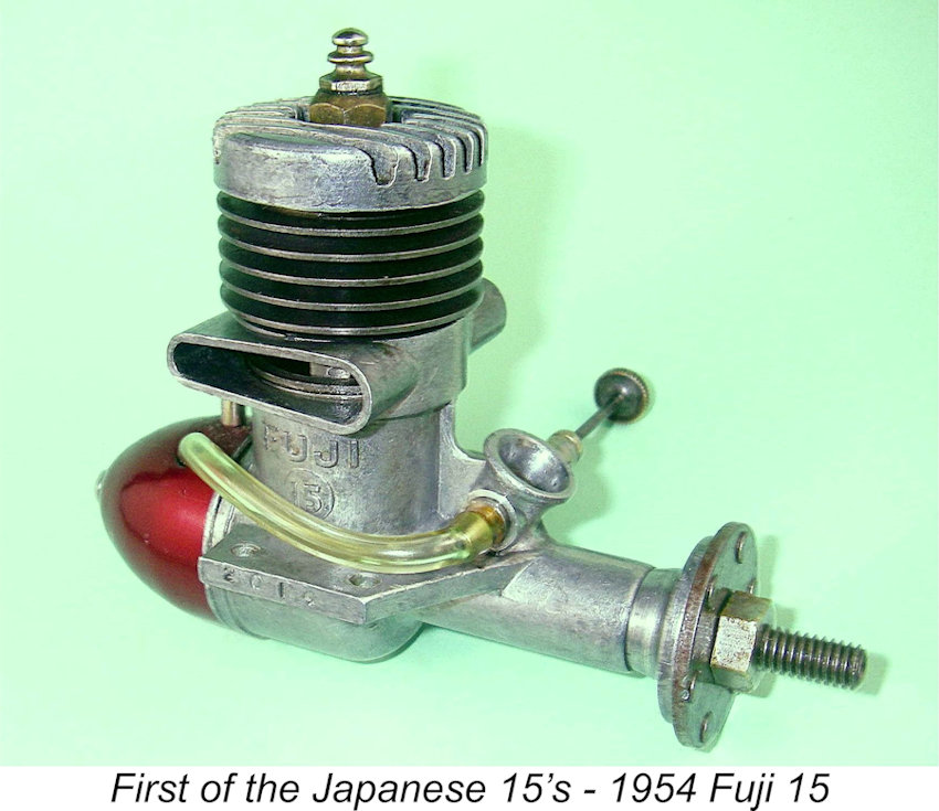 The first Japanese-made 2.5 cc (.15 cuin.) glow-plug engine to appear was the twin-stack Fuji 15 of 1954. The development of this unit was likely triggered by the FAI’s announcement that from 1955 onwards, FAI-sanctioned international power model competitions (other than control-line stunt and R/C) would be restricted to engines of 2.5 cc displacement.