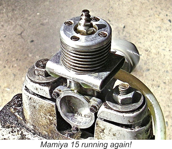 Warring noted specifically that this engine was not commercially available in Britain, so presumably it was included mainly as a “curiosity” and an interesting insight into the then-arcane world of Japanese model engines. It must be remembered that since few British modellers had ever so much as seen a Japanese engine at this time, there was a certain Oriental mystique and a great deal of misconception regarding engines from that country. Ron Draper’s O.S. Max-powered victory at the free-fight World Championships later in 1956 was to change this perspective forever, but that event still lay in the future when this test was published. Warring was unstinting in his praise of the Mamiya .15’s overall quality, stating that it was “characterized by first-class design and workmanship throughout” and that it was “better than the average American glow motor as regards crankshaft bearing fit and good compression”. It is difficult for us to realize today that at the time in question these comments would have come as a great surprise to most British modellers, who still tended to subscribe to the prevailing elitist contemporary view of Japanese products as being at the lower end of the quality scale. Warring singled out the quality of the rather intricate crankcase die-casting as being particularly worthy of comment. He was also quite impressed with the engine’s unusual transfer porting arrangement, characterizing this as “particularly clever”. However, he quite legitimately criticized the nearness of the rather “fiddly” needle valve to the propeller disc, also stating his view that the mounting lugs could have been made somewhat stronger. One of the lugs on his test example was apparently cracked. An oddity in Warring's test report was his statement that the cylinder assembly screws were 7BA items, while the prop mounting thread was 1BA! Very odd for a Japanese motor of this vintage! All I can say is that my example uses M2.5x0.45 cylinder assembly screws, while the prop mounting thread is M5x0.8. Admittedly, these are very close to the BA equivalents cited by Warring - perhaps his measuring was in error.