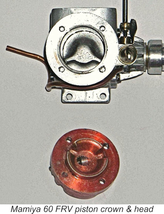The cast alloy cylinder head too was noteworthy, featuring fins which were higher at the front than at the rear (another feature emulated by Enya in their initial die-cast .19 and .29 models of 1953) allied with a steeply-angled ¼-32 plug located very individualistically at the rear of the head. Most unusually for such a large engine, only four screws were used to retain the head in place. This may have given rise to sealing problems, as we shall see when we come to examine the Mamiya 60 RV model in the following section of this article. The fact that no gasket was used to seal might also have contributed to this problem - the head was simply lapped onto the top of the liner. A recessed "blowout proof" gasket in the head would likely have done a far better job of creating a durable seal.