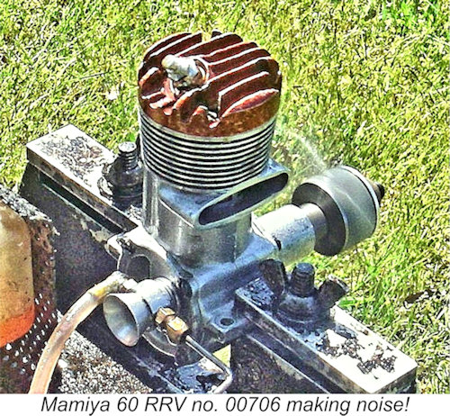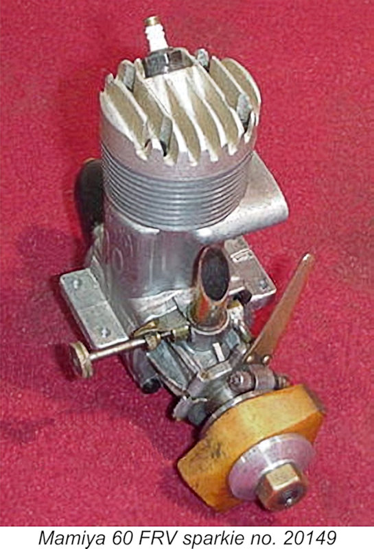 In 2016 a seemingly-pristine example of the Mamiya 60 FRV spark ignition model appeared for sale on eBay. To all appearances, this was just another example of the engine described above, albeit a very nice complete one which retained its tank and sported the gold high-compression head. Its fuel line had been cut to allow the use of a separate tank, but in all other respects it appeared to be a very fine example.
