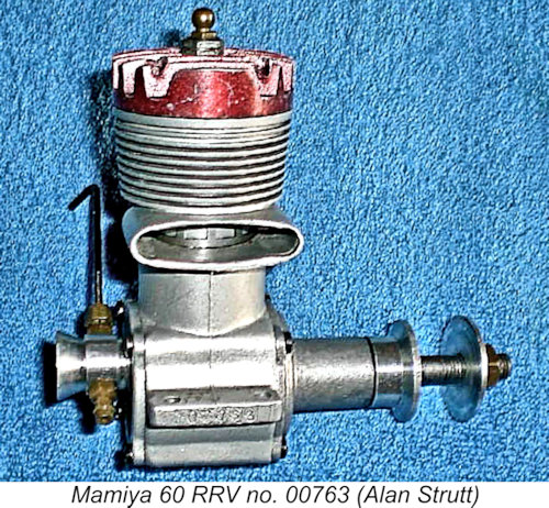 This model is extremely rare today, so I’m extremely fortunate in owning two examples, both in fine condition. These are the only examples which I’ve ever encountered personally in the metal. My good fortune enables me to include a few images and some details of this extremely elusive powerplant. Measured bore and stroke of my two examples of the Mamiya 60 RRV are identical to those of the FRV model described earlier at 23.90 mm and 22.20 mm respectively for an unchanged displacement of 9.96 cc (0.61 cuin.). The RRV engine is notably compact and lightweight for a racing engine of this displacement - it weighs in at just 278 gm (9.80 oz.), which is actually less than its FRV counterpart described earlier. This makes it one of the lightest racing 60’s ever manufactured. The above bore and stroke measurements are consistent with those given in the summary of the “World’s Model Engines” which appeared in the early 1958 British publication “Model Aero Engine Encyclopaedia”. However, there is a substantial discrepancy in the weight figures. The table in the referenced publication gives the weight of the Mamiya 60 RRV as a very hefty 16 ounces, which is very much at odds with the figure for my examples. The quoted speed range was 10-16,000 rpm - a typical spread for a 10 cc racing engine at the time.