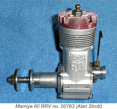 The relative numbers of known survivors argue very strongly against this possibility - the 60 RRV is far less frequently encountered than the companion FRV variant, which is itself far from common. Looking at the matter quite objectively, it seems more likely that the numbering sequence for this model started at some intermediate point. In that regard, the most logical assumption is that the serial numbering sequence for the Mamiya 60 RRV started at 00701. This starting point would be completely consistent with the previously-expressed idea that my lower-numbered example is one of the first such engines produced. The fact that it features an earlier-style head along with a spark ignition prop driver and shaft certainly seems consistent with the idea that it was assembled at a time when the design was still evolving. If the above hypothesis has any validity, we have evidence for the production of at least 63 examples of the Mamiya 60 RV glow-plug model. This is completely consistent with the extreme rarity of surviving examples, which suggests that the number manufactured was very small. Only the provision of more serial numbers for this model would help to resolve this question of numbers. Contributions, please!! One realistic possibility that does suggest itself is the notion that this engine followed directly on from the FRV spark ignition model after production of that model ceased. The fact that there is presently no evidence whatsoever that a spark ignition version of the Mamiya 60 RRV was ever manufactured implies that the switch to glow-plug ignition and the change to RRV induction occurred simultaneously. Basically, the admittedly-scanty evidence available at present suggests that the RRV glow model replaced the FRV sparker rather than being offered simultaneously as an alternative. As noted previously, the Mamiya 60 RRV is included in the listing of the “World’s Model Engines” which appeared as an appendix to the early 1958 publication “Model Aero Engine Encyclopaedia”. This cannot be taken as an indication of continued production, since the above-noted list was already woefully out-of-date at the time of publication. However, it does indicate that the engine was by no means forgotten as of early 1958. It is also worth noting that the FRV version was missing from this list. This appears to confirm that the racing model outlived and most likely succeeded its earlier general-purpose sibling, which is very much in keeping with my earlier speculation. It is certainly evident that the RRV version of the Mamiya 60 was introduced at a later date than the FRV version since it appears never to have been produced in spark-ignition form - at least, I cannot find a report of any original examples of such a model, although owner retro-conversions may well exist. Conclusion Reviewing the above account, it seems likely that well under 1,000 examples of all Mamiya 60 models combined were manufactured in total. This figure certainly explains the comparative rarity of these engines today. The RRV racing glow-plug model is particularly elusive – it seems likely that only 100 or so examples of that model ended up being made at most. Despite this, these engines constitute a legacy of which Minoru Sato could be justifiably proud! No true model engine enthusiast can fail to be impressed by these fine examples of the model engine manufacturer’s craft! Just wear hearing protection if you're ever around one of these motors in operation - they're LOUD!! _________________________ Article © Adrian C. Duncan, Coquitlam, British Columbia, Canada First published April 2026 |