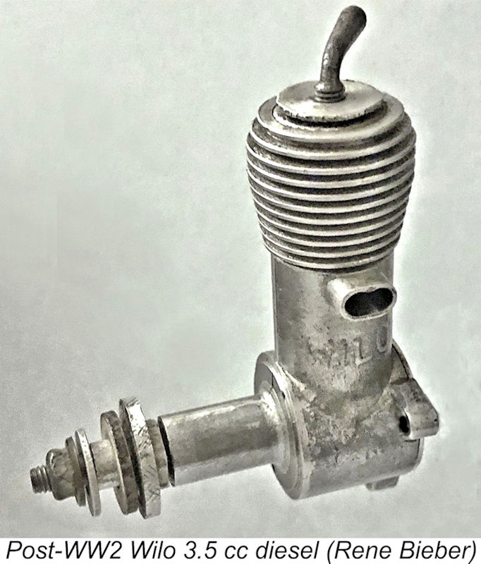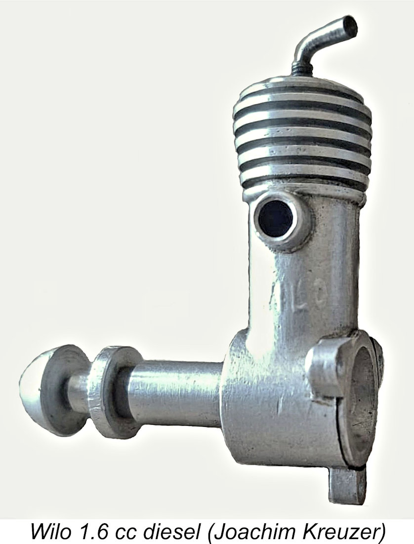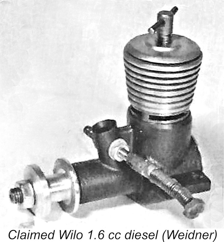 The previously-mentioned Wilo 3.5 cc diesel of 1943 seems to have been manufactured by Willi Otto himself in a small series. However, the first Wilo models to be put into series production after WW2 were evidently the Wilo 1.6 cc and 3.5 cc sideport diesels which were manufactured for Willi Otto by MODELLKRAFT in East Berlin. These units bore a strong resemblance to the early Czech Atom models. The 1.6 cc version featured bore and stroke dimensions of 12 mm and 14 mm respectively for a nominal displacement of 1.583 cc. Weight without tank was cited as a remarkably light 80 gm (2.82 ounces). Claimed output was 0.118 BHP @ 9,000 RPM.