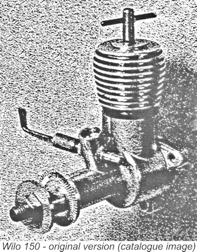 A surviving catalogue image (right) shows that the original Wilo 150 was effectively just a modified Wilo Fox with its bore increased from 12 mm to 12.5 mm for a displacement of 1.47 cc. This version of the 150 retained the Fox's radial mounting. However, this variant was soon replaced with the more familiar beam-mounted unit. The bore and stroke of this engine are given as 12.5 mm and 12 mm respectively in the 1954 instruction leaflet. However, the Wilo 150 appears to have been the subject of some experimentation by the designer - the later examples featured further-modified bore and stroke dimensions of 12.7 mm and 11.8 mm respectively, maintaining the displacement but shortening the stroke slightly.