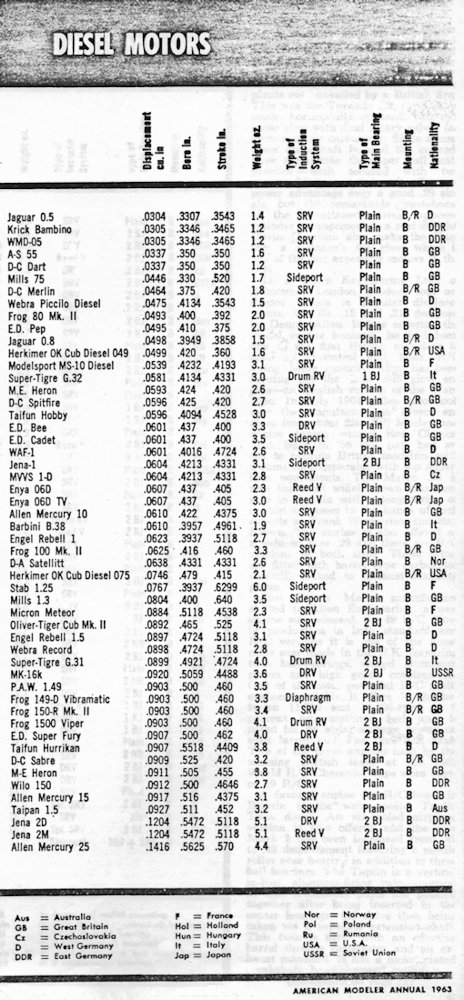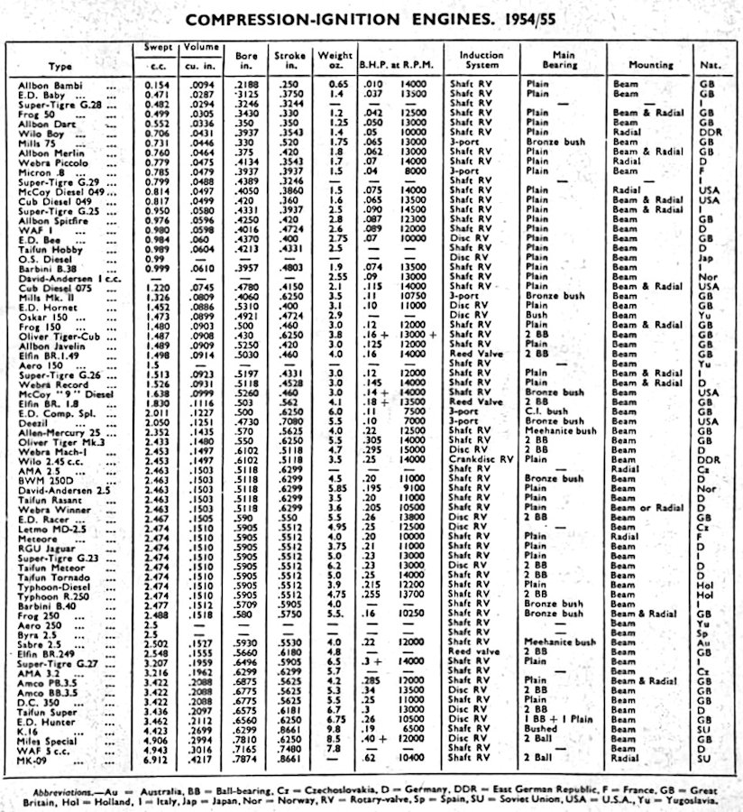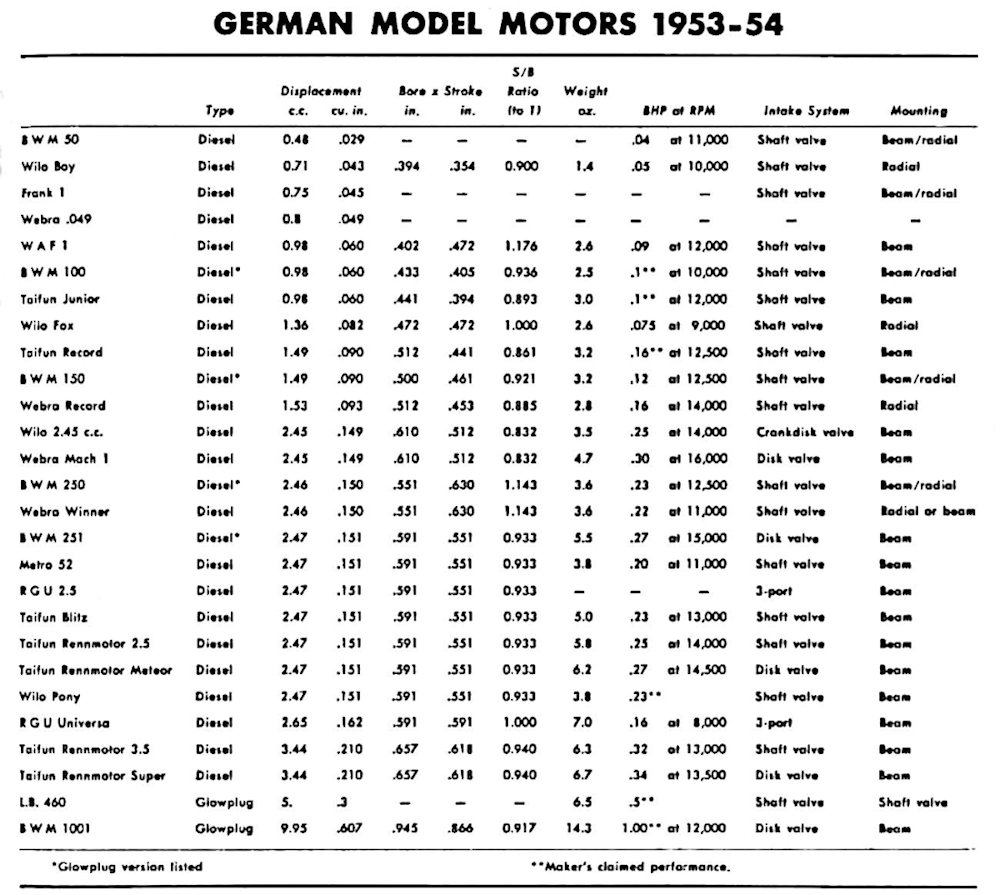 Chinn followed this up with a more comprehensive look at German model engine production which appeared in the April 1954 issue of MAN under the title “Boom in German Engines”. This article included the attached table (left) providing details of all of the German engines known to have been in production during 1953/54. The Wilo “Boy” and “Fox” appeared in this table, but the 2.47 cc “Pony” was absent, evidently having been supplanted by the 2.45 cc front disc valve model. Chinn stated specifically that the 245 was a more recent production.