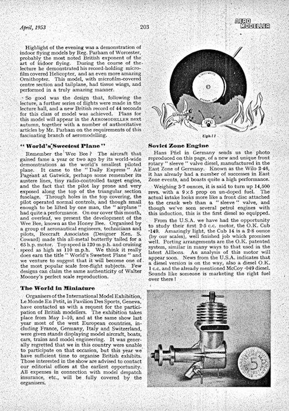 The scarcity of engines in post-war West Germany was noted, the supply being largely confined to some pre-1945 examples of the Kratmo and Eisfeld engines which had survived the war; a few home-built units; and a handful of engines which had "leaked through" to the British Zone from the Russian and American Zones. Eisfeld was said to be still making some engines, as was Walter Kratzsch of Kratmo fame in East Germany. The article also noted the existence of "two small companies manufacturing the Ridi II, a 2.2 cc job with finned crankcase and integral tank (made by Friedrich Richter - A.D.), and the Wilo 1.6 cc, an engine rather like the E.D. Bee made in Bremen by H. D. Guldner. Production is limited........."