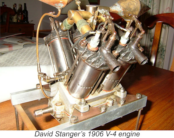 During the same period, automotive engineer and pioneering aeromodelling enthusiast David Stanger had become fascinated by the prospect of achieving powered model flight and had designed and built his own petrol engine intended for that use. His first engine was a four-cylinder 120 cc air-cooled four-stroke V-4 type. It was designed in 1905 and built by the 35 year-old Stanger in his own workshop in 1906.
