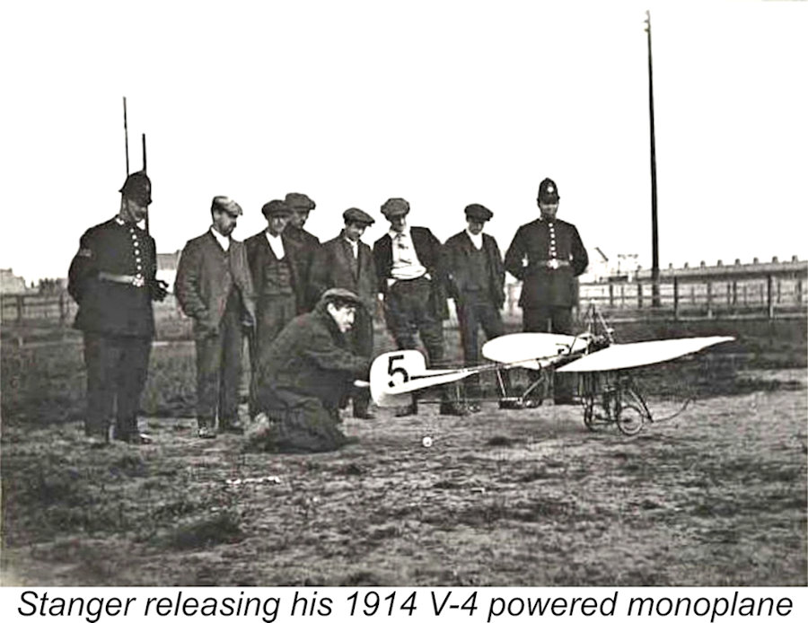 Both the V-2 powered canard pusher biplane and the V-4 powered tractor monoplane were exhibited by Stanger at the 1914 Aero Show held at Olympia in West Kensington, London. A highlight of the show must have been the flying demonstrations that Stanger conducted with both models at Hendon Aerodrome (you can just see the delight expressed in the body language of the London Bobbies at left and right in this photo of Stanger releasing the monoplane).