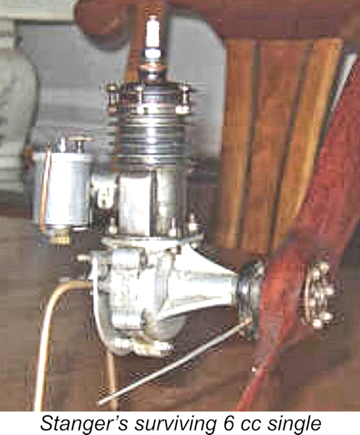 Stanger also built a number of single-cylinder two-stroke engines. The smallest of these had a displacement of only 1 cc. The single-cylinder series of engines powered models with both biplane and monoplane configurations. One of these engines, a 6 cc model built in 1925, was clearly well ahead of its time, looking far more like a late-1930’s design than one dating from 1925. A fascinating feature of this unit was that it had a mechanical timer driven by a shaft extension at the rear which cut the ignition after a pre-determined running time.