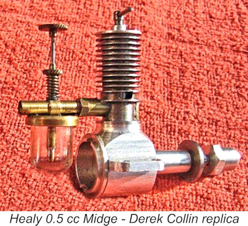 At about this time, a certain Basil Healey of Ilford in Essex was developing his own design for a small model diesel engine called the Midge and manufacturing it in very small numbers in his own home workshop for sale locally. The stereotypical one-man "garden shed" operation, in fact! The Healy engine was made in several displacements from 0.5 cc through 0.99 cc to 1.2 cc. Healy's location is often reported as Rayleigh, Essex, but the late