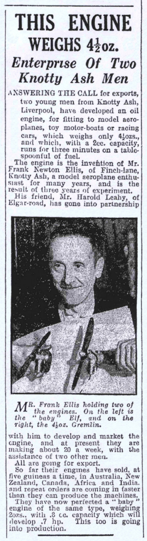 In this article, I’m privileged to be able to present the story of Frank Newton Ellis and the Elfin model engine range from Liverpool, England at a level of detail never previously attempted. What follows is based primarily on the first-hand evidence of several taped interviews with Frank himself which were conducted by family friend Jim Woodside around 1990, when Frank was approximately 81 years old.