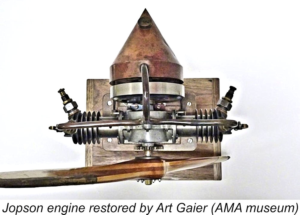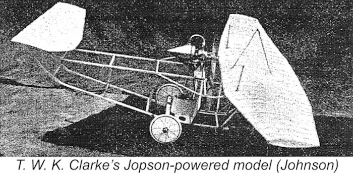 As an example, the diagram showed that an engine running at 1,540 RPM on a 30 in. dia. airscrew with a pitch of 15 in. would develop a thrust of 9½ pounds. Fair enough if true, but of course the key question was whether or not the engine would actually turn a 30x15 airscrew at that speed! The diagram was silent on that point. Given the fact that David Stanger’s contemporary slightly larger-displacement V-2 could only manage 2,000 RPM on a 22x18 prop, it seems doubtful to me that Jopson’s creation could have turned a 30x15 prop at 1,540 RPM. A 25 in. dia. airscrew would appear to be somewhat nearer the mark. Nevertheless, there are good grounds for believing that Jopson’s engine was seen by some as a useable model powerplant. Photographs published in the book “Model Aeroplaning: Its Practice and Principles” by Valentine Edward Johnson in 1922 Despite all of the information provided on Clarke’s model (including his closing statement, “Note the neatness and compactness of the plant, also its high position and the large size of the propeller.”), what he notably does not provide is details about any flights made with the model. However, T. W. K. Clarke is known to have sold both model and full-scale airplanes, also being an active aeromodeller and a frequent contributor to “FLIGHT” magazine. This being the case, it seems almost certain that he had tested the engine and found it to be an acceptable performer, otherwise why spend the time and effort constructing a model for it? Since he undoubtedly did so, there’s every reason to assume that he must at least have tried to get the model off the ground with the engine running – it seems doubtful that he would publicize a model which he knew to be a non-performer. That said, if any record of such attempts exists, it has yet to be located. The Art Gaier Restoration