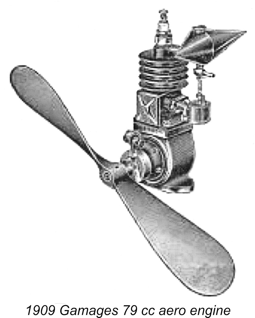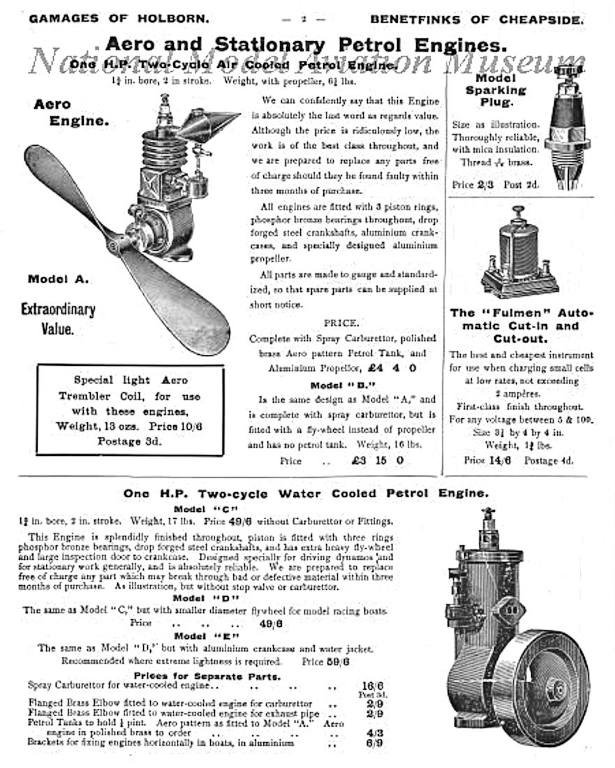 The selling price of this unit as originally released was £4 4s 0d (£4.20) complete with fuel tank, a spray-type carburettor and a matching airscrew. It was also available with a flywheel in place of an airscrew for boat applications, the price being £3 15s 0d (£3.75). It was clearly equipped for trembler coil ignition, since a matching “special light aero trembler coil, for use with these engines” was available for 10s 6d. Since this coil weighed no less than 13 ounces (!!), the term “light” might appear to us to be somewhat inappropriately applied! To complete the package, miniature spark plugs were offered at 2s 3d (£0.11). Gamages claimed an output of 1 horsepower at unspecified RPM for this engine. A watercooled version of essentially the same engine for marine or stationary use was also available.