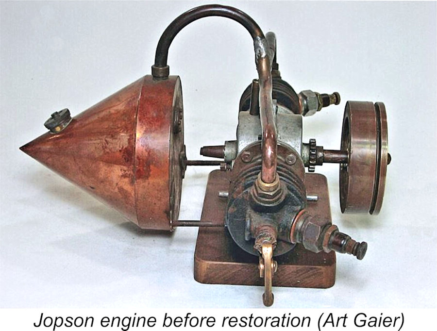 Many decades after its original manufacture, an incomplete example of the Jopson engine somehow came into the possession of Art Gaier of the USA. The engine couldn’t have fallen into better hands, since Art was an engineer and a talented machinist who was extremely well qualified to undertake the restoration of such a unique piece of model engine history.