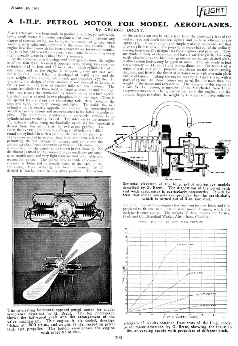 That first engine was an air-cooled four-stroke four-cylinder "V" type. Each of its four cylinders had a 1.25 in. bore, which combined with a stroke of 1.5 in. to yield a total displacement of 7.36 cuin. (120.6 cc). The engine weighed 5½ pounds (88 ounces) complete with gravity-fed carburettor and petrol tank – actually a commendably low weight for an engine of this displacement and complexity. Stanger estimated the power output as 1¼ BHP at 1,300 RPM, at which speed the engine reportedly turned a 29 in. diameter prop having a pitch of 36 in. Plenty of low-end torque on tap! Stanger’s achievement in designing and building an engine of such relatively small dimensions by the standards of the day which operated with a high degree of efficiency by those same standards can only reflect positively on his deep appreciation of I/C engine principles and design at a time when such knowledge was confined mainly to the few who had attempted to build full-sized engines.