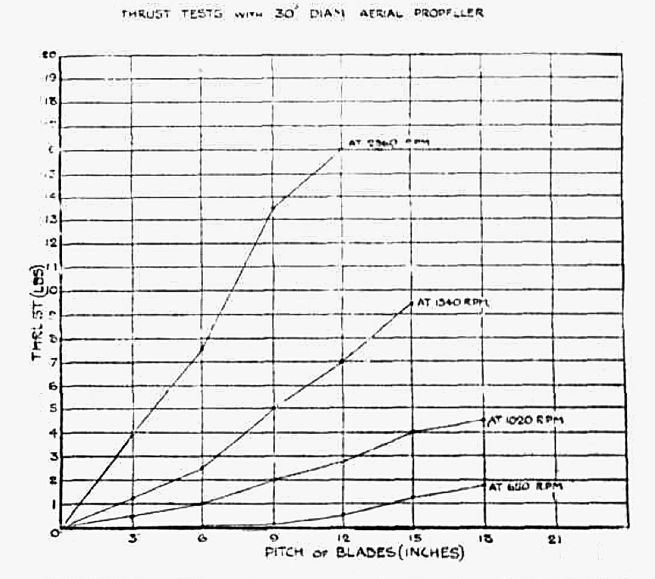 The results of a series of tests on a 30 in. propeller set at various pitches were shown on the accompanying diagram which appeared as one of the illustrations with George Brent’s 1912 article. This diagram showed the thrust developed at certain speeds with a given pitch