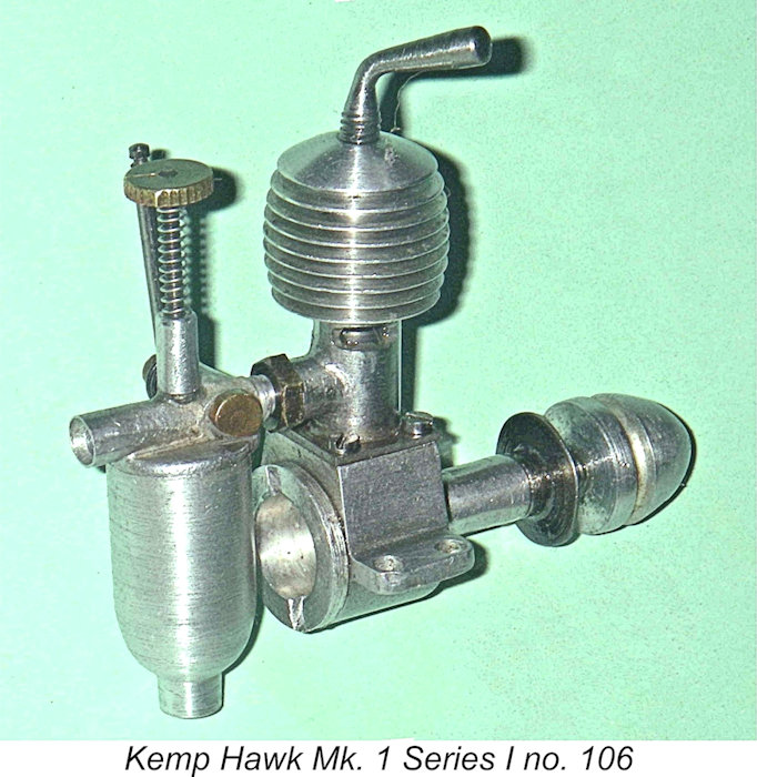 The original Mk. 1 version of this neat little powerplant was apparently launched upon the market in January 1948 or thereabouts, making its initial advertising appearance in the Henry J. Nicholls "Aeromodeller" placement of February 1948, as noted previously. It remained in production for about a year, undergoing a number of modifications over that period. It was named the Hawk from the outset, evidently being the first Kemp model to receive one of the well-known "Bird Of Prey" names with which the Kemp and “K” engines are associated. As noted earlier, the sideport version of the 1 cc Eagle appeared after the Hawk, thus becoming the second model to be so named. The Vulture, Falcon and Kestrel were all to follow.